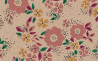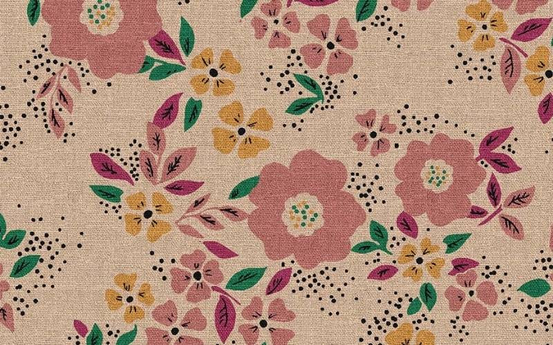 Loneta/ Canva con estampado floral con tonos rosas, amarillo y fondo lino.