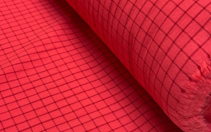 Tejido de algodón y poliéster reciclado con un efecto arrugado en color Ocre y Burdeos.