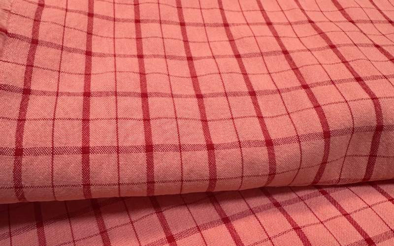 Tejido de algodón y poliéster reciclado con un efecto arrugado en color Rosa y fresa.