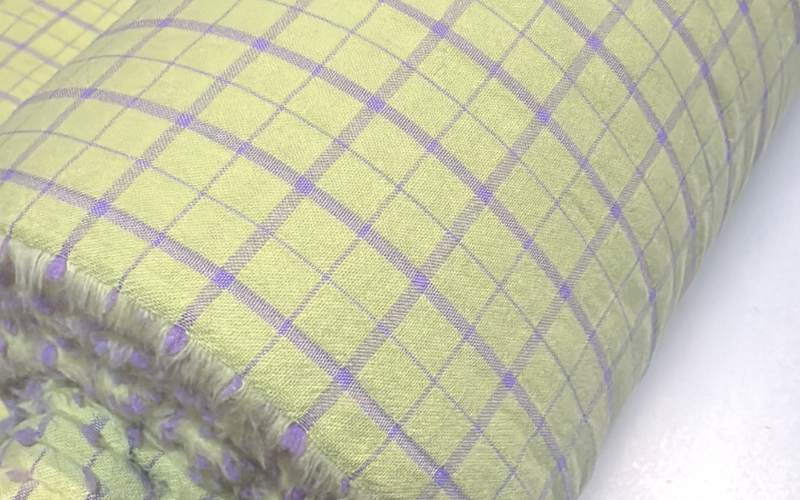 Tejido de algodón y poliéster reciclado con un efecto arrugado en color Lima y Lila.